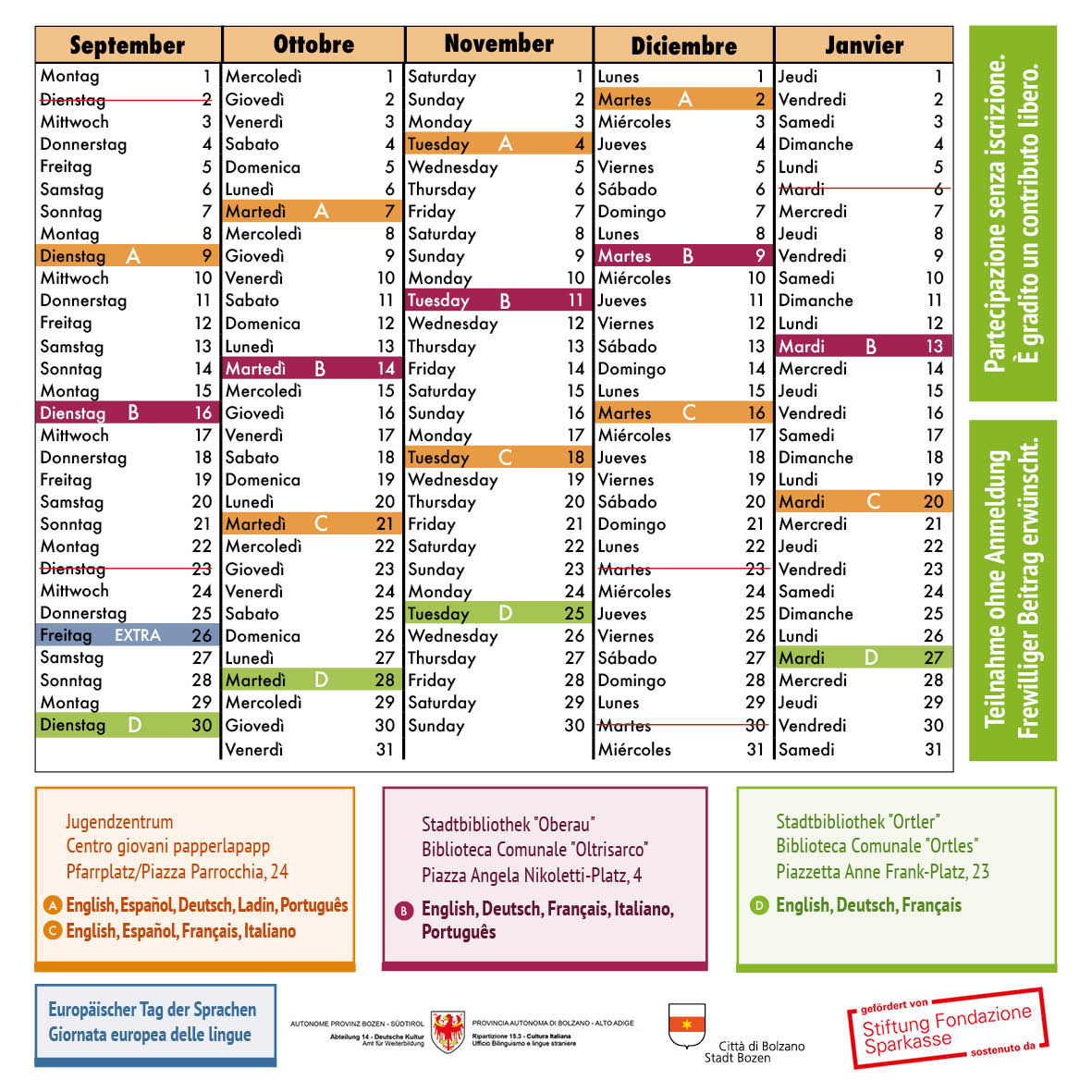 Jeden 2. Dienstag im Monat wird die Sprachlounge vom Jugendzentrum Papperlapapp und der Sprachschule "Alpha beta Piccadilly" in der Bibliothek Oberau organisiert.